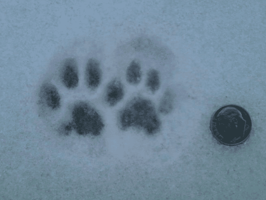 Domestic cat tracks are oval and are an average of 1 1/4 inches in diameter (specific measurements from Elbroch 2003: front track L: 1 – 1 5/8 in. W 7/8 – 1 3/4 in.; rear track L 1 1/8 – 1 1/2 in. W 7/8 – 1 5/8 in.). The front track often appears asymmetrical, and the claws usually do not show in either track. The walking stride is 6 – 12 1/2 inches long and 2 – 4 3/4 inches wide. In deep, powdery snow, the prints may not be visible, but the trail shows a distinct triangular pattern.