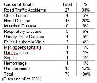 Table 1 shows the relative frequency of different causes of sudden death. By far the most frequent cause of sudden death (34%) was attributed to trauma caused by road traffic accidents (RTAs). All but two of the RTA deaths were outdoor-access cats, so that means that 51% (25 out of 49 total) of outdoor-access cat deaths were due to RTAs. Other types of death due to trauma were 3 dog bites and 1 gun shot.