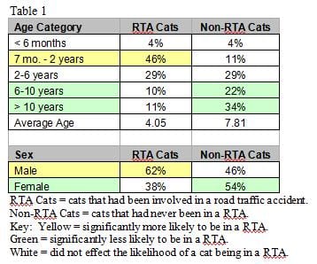 Road traffic accidents (RTAs) are a common cause of injury and death for outdoor-access cats. Olsen and Allen (2001) found that 51% of outdoor-access cats that suddenly and unexpectedly died were the result of RTAs, and Rochlitz et al. (2001) found that RTAs were the forth most common cause of death for cats after old age, cancer, and renal failure. Based on the results of this study, Rochlitz (2003) conducted a more in-depth study to determine which factors may predispose cats to being involved in a RTA. This study is particularly interesting because the results can be used to improve behavioral profiling of lost outdoor-access cats.
