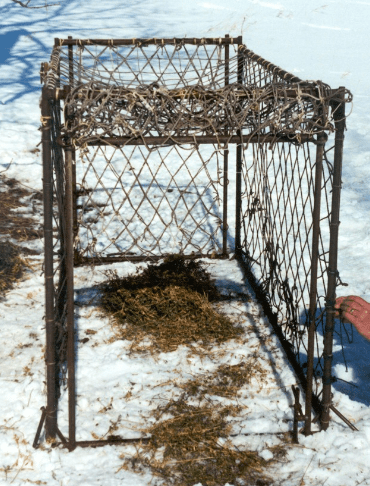 This type of netted-guillotine door might also be modified to attach to a larger dog enclosure trap like this one. This enclosure trap is meant to be monitored and manually triggered when the dog enters, so chewing through the netting wouldn’t be a concern. This particular trap uses a large wire-fence door, which makes the trap very comfortable to enter, but the door takes up more space within the trap and is slower to close than a guillotine door. Here’s a video of my dog being caught in the trap. Other enclosure traps often use a solid guillotine door, which can be intimidating for the dog to walk under.