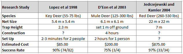 Jedrzejewski and Kamler’s (2004) drop net design is more labor intensive to set up and costs significantly more than the other designs (though even this net is far cheaper than the commercially available ones). However, this net is also three to four times the size of the other nets since it was being used to capture the much larger red deer. Modifications of the net set up and trigger mechanism could probably be used on a much smaller net though the success rate would most likely decrease.