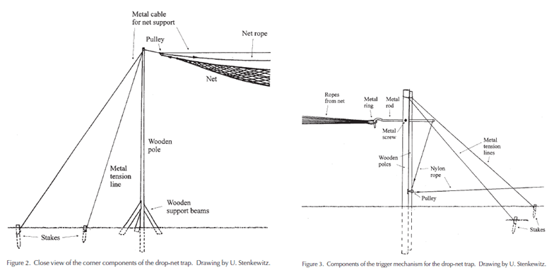 This drop net was built on a semi-permanent frame constructed of wooden poles sunk into the ground and braced with metal cables to support the weight of the net. A pulley was attached to the cable at the top of each wooden pole. Nylon ropes were then attached to the net near each pole, and the ropes were run through the nearest pulley. All the ropes were tied to a single metal ring at the trigger mechanism with ropes on the far end coming across the top of the net. The trigger mechanism is simply a hook through a metal ring, which releases when another rope is pulled. This might sound complicated, but it will make a lot more sense when you look at the diagrams. For complete instructions, see Jedrzejewski and Kamler’s (2004) Trap description and construction.